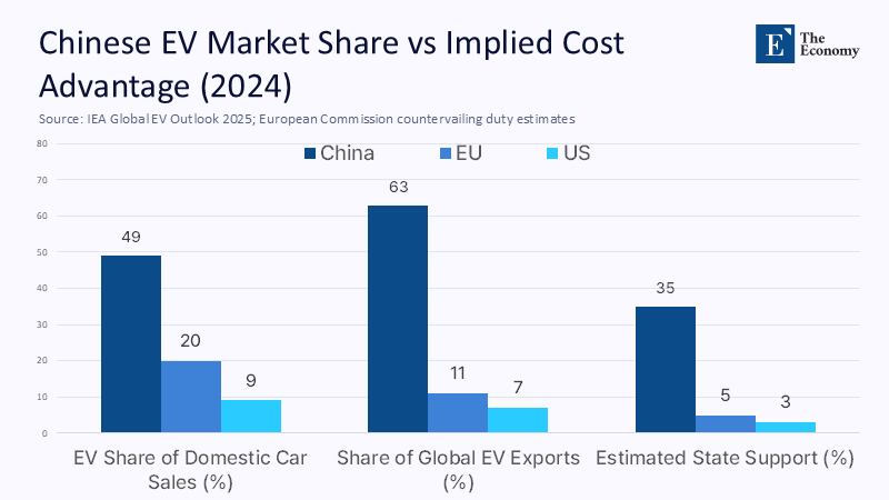 In electric vehicles, the scale of distortion is even more complex. The International Energy Agency reported that nearly 50% of all cars sold in China in 2024 were electric, accounting for over 60% of global EV sales. While consumer subsidies have declined, producers benefit from land grants, policy-bank loans, VAT rebates, and reduced utility costs. Investigations by the European Commission into Chinese EVs concluded that state incentives lower effective production costs by up to 35%, justifying provisional countervailing tariffs between 17% and 38% in 2025. These findings correlate with pricing anomalies: Chinese EVs sold in Europe undercut local models by 15% to 25% while generating near-zero profits domestically—a pattern that is unsustainable without external financial support. This is not export competitiveness born of efficiency; it is strategic subsidization designed to flood markets and displace incumbents.