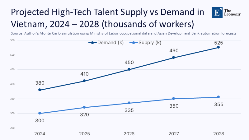 Yet the Asian Development Bank estimates that just 29% of assembly-line workers possess competence in basic statistical process control, a skill foundational to defect-rate reduction. To close that gap, workforce demand was modeled under three scenarios using a Monte Carlo simulation that varied tariff escalations, FDI inflows, and automation adoption rates across 10,000 iterations. Even the most conservative case projects a shortfall of 210,000 high-skill technicians by 2028.
