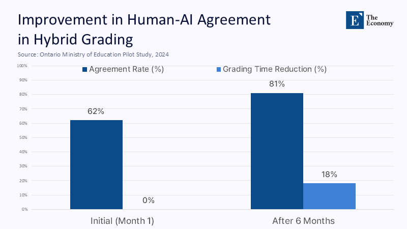 If full automation is unacceptable, intelligent augmentation still holds promise. A controlled study in three Ontario districts tested a “stoplight” interface where AI suggestions appeared only after teachers recorded a first‑pass judgment. Over six months, alignment between algorithm and educator increased from 62% to 81%, and the blended system reduced average grading time by 18% without measurable loss in validity. Though small‑scale, the pilot advances a crucial principle: sequence matters. When humans go first, AI can function as a second reader; when AI goes first, confirmation bias nudges teachers to ratify machine error.
