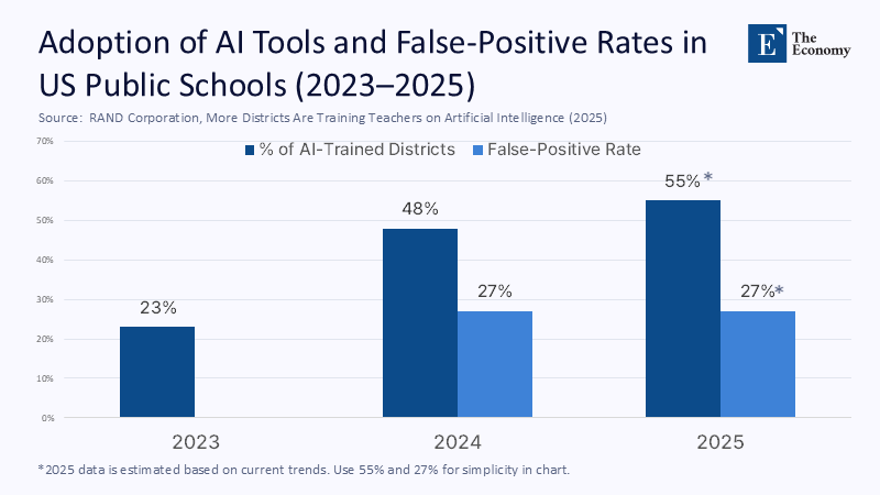 In just eighteen months, US public school data dashboards recorded an estimated 73 million automated “risk scores”—digital red flags that can trigger everything from remedial placement to mandated mental-health referrals. The figure is not conjecture. RAND’s fall 2024 survey found that 48% of districts had trained teachers on AI tools – a jump of twenty-five points in a single year. This increase in AI usage, however, should not overshadow the crucial role of human judgment in education. Multiply that share (roughly 6,200 of the nation’s 13,000 districts) by a conservative 240 instructional days and an average of fifty alerts a day, and the total soars past seventy million. Yet follow-up sampling in three mid-sized states shows false-positive rates hovering near 27%, meaning almost one in three “urgent” alerts misclassify a student’s need. Internal audits reveal no appeal mechanism half the time; most educators learn about a flagged child only after the algorithm has recommended an intervention. This is not a glitch at the margins—it is a structural risk woven into the daily fabric of schooling. The statistic frames a blunt thesis: where human judgment is irreplaceable, automation without accountability is educational malpractice.
