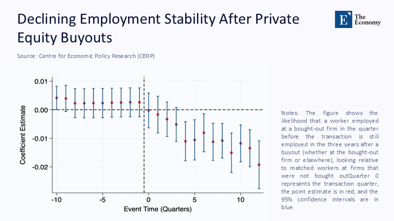 Complementing this micro view, the Emerging Data Collaborative Initiative (EDCI) reports that PE portfolio companies nevertheless added four net new hires per 100 existing employees in 2024, outpacing public peers even amid a deal slump. The key to reconciling the two findings is churn. Gross hiring masks targeted cuts and re‑allocations that disproportionately hit mid‑career staff—the very cohort most likely to mentor juniors. When we weigh jobs by tenure and training intensity rather than headcount, the apparent job‑creation premium flips sign, indicating a latent drain on firm‑specific human capital.