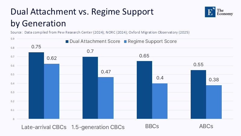 The composite story is unambiguous: the younger one’s migration age and the more immersive the host‑country schooling, the wider the gap between cultural pride and political skepticism. When plotted longitudinally, Dual Attachment hovers near 0.70 for 1.5 CBCs but falls to 0.55 among ABCs, whereas Regime Support remains above 0.60 for late‑arrival CBCs yet dips below 0.40 for ABCs. These metrics turn hazy intuitions into actionable intelligence for curriculum planners and dean‑of‑students offices alike.