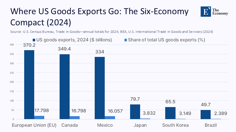 Roughly 60% of all US goods exports go to just six partners: the European Union, Canada, Mexico, Japan, South Korea, and Brazil. In 2024, the United States shipped about $2.08 trillion in goods worldwide. Of that, $370.2 billion went to the EU, $349.4 billion to Canada, $334.0 billion to Mexico, $79.7 billion to Japan, $65.5 billion to South Korea, and $49.7 billion to Brazil—amounting to approximately $1.25 trillion combined. That demand is not a talking point; it is a lever. Used together, it changes the bargaining math of any unilateral tariff campaign. With tariff deadlines, Section 232 probes, and bespoke bilateral deals now setting the tone—most recently a US–EU pact anchoring a 15% tariff and a US–Japan deal tied to a massive investment package—the question is no longer whether individual countries can negotiate down their pain. It is whether this six‑economy compact will exercise its collective market power, set conditions together, and force a predictable path back to rules‑based trade. The data say it can. The times say it must.