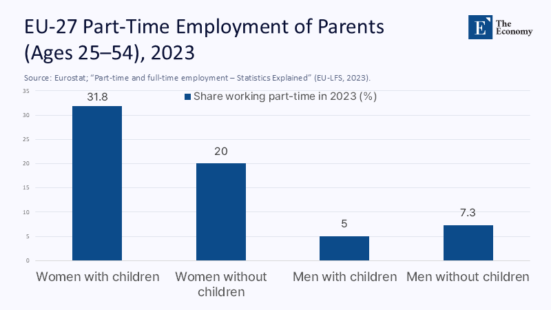The contemporaneous facts are clear. Across the OECD, the median gender wage gap was about 11.5% in 2023. A multiple-country meta-analysis pooling more than 2,000 estimates finds a robust "motherhood penalty" in wages—modest on average per child but sizable in the short run around births and persistent without supportive policy. Within the EU in 2023, 31.8% of employed mothers aged 25–54 worked part-time versus 5.0% of fathers, and Germany remains striking, with roughly half of employed women working part-time compared to about one in eight men. If we take a conservative back-of-the-envelope approach—combine a 12% wage gap with a 0.5 probability of part-time for mothers in high-cost childcare settings and assume part-time hours reduce earnings by one-third—we estimate a lifetime earnings shortfall for median mothers of roughly 20–25% relative to comparable fathers, before compounding. That estimate is transparent and adjustable: change the childcare subsidy or the probability of part-time, and the wedge moves mechanically. Notably, the ILO shows that including informal work widens gaps further in lower-income settings—another reminder that the representative agent cannot carry the policy load alone.