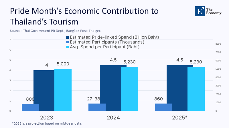Start with the topline: the WTTC estimates travel and tourism contributed 10.4% of Thailand’s GDP in 2023 (THB 1.86 trillion, including indirect and induced effects), with further growth projected through the next decade. Within that base, June Pride activities are becoming a measurable seasonal driver. Government and media estimates for 2024–2025 cluster around 4–4.5 billion baht in Pride-linked spend and roughly 860,000 participants—a sizeable micro-season when considered against monthly tourism cash flows. The passing of marriage equality in 2024, implemented in 2025, removes a decision-friction for couples considering weddings, honeymoons, or family travel. A clear legal regime is an on-switch for demand; it converts intent into booking.