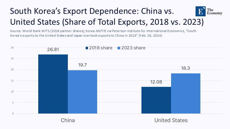 Economically, the picture is shifting. After two decades with China as the top buyer, late-2023 and early-2024 brought months when Korean exports to the United States overtook China, reflecting a structural rebalancing: South Korean shipments to China fell nearly 20% in 2023, with China's share dropping below 20% for the first time in twenty years. Official and research assessments point to Chinese import substitution reducing Korean intermediate-goods sales, even as AI memory demand props up overall exports. The policy implication is obvious: preserve deterrence and trilateral habits while methodically de-risking inputs and customers where Beijing's policy levers are strongest.