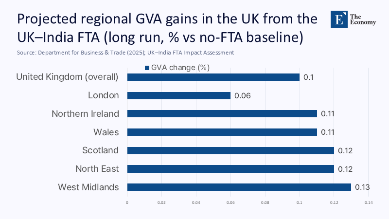 Country-level evidence points the other way. The government’s assessment finds higher GDP, higher real wages, and higher GVA across all nations and English regions, with concentrated output losses limited primarily to textiles and apparel. Tariffs on UK export stalwarts fall in clear, staged steps; duty savings for British exporters start at around £400 million right away and rise to £900 million at complete staging. In parallel, London’s finance and professional-services ecosystem retains global scale and can intermediate Indian capital and mandates at growing volumes. That is the definition of a win-win at the national level: consumers get choice, regions with tradable strengths get orders, and the City gets work it can do better than almost anyone. The correct policy response is to cushion the concentrated losses, not to deny the aggregate gains.