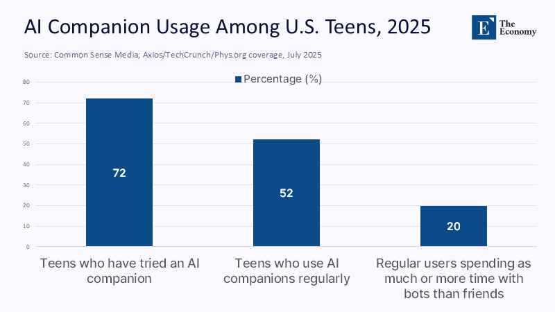 The demand shock is not hypothetical. Character-style AI companions report tens of millions of users with unusually long session times. Replika says it has surpassed 30 million. Research shows that a non-trivial percentage of young adults believe that AI partners could substitute human romance, and an extensive survey of teens shows that "AI companions" are already routine. All of this comes amid a documented increase in loneliness among young people. Recent polls place daily loneliness for young American men at about one in four.