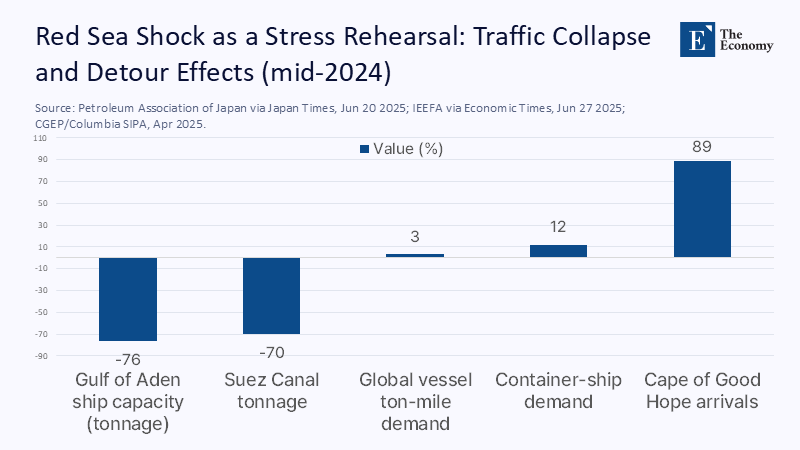 Two sea corridors connect East Asia with the energy of the Middle East: the Strait of Hormuz and, for some routes, the Bab el-Mandeb/Red Sea-Suez axis. Hormuz alone handles about one-fifth of the world's liquid oil and about one-fifth of the world's LNG, with Qatar's cargoes being particularly exposed. Even without a complete shutdown, harassment and repricing of insurance can move the markets. The Red Sea crisis from the end of 2023 offered a live demonstration: by mid-2024, the capacity of ships crossing the Gulf of Aden was reduced by 76% and the capacity via Suez was decreased by 70%, forcing Cape of Good Hope bypasses that increased global ship demand by 3% and container ship demand by 12%. Such bypasses add 10-14 days to Asia-Europe crossings, increase fuel use, and escalate inventory costs for East Asian manufacturers who already manage thin margins.