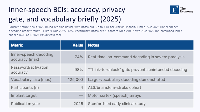 The past 18 months have redefined the possible. A May 2024 study, summarized in Scientific American, silently decoded imaginary words from a neuron's activity in the extracellular helix, reaching an accuracy of 79% in one participant in a small vocabulary and showing common neurons between internal and vocal speech. In August 2025, a new Stanford paper described the decoding of internal speech by motor cortex arrays with a command accuracy of up to 74%, a vast vocabulary, and a password that prioritizes privacy. These systems differ from the 2023 "speech BCIs" that required attempts at vocal tract movements. Internal speech systems work when users think of the word. Together, these trajectories imply convergence: higher-density electrodes improve phoneme decoding. Machine learning models stitch phonemes into words. And semantic decoders provide scaffolding when the audio signals are noisy. The result is a reasonable path to fluent, silent production.