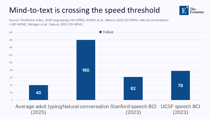Speed matters because modern education is built on time boxes. Standard adult typing averages 40-60 words per minute. High performance can maintain 80+. Stenographers reach 100+. In 2023, invasive speech BCIs accounted for 62-78 wpm in laboratory settings for severely paralyzed participants, progressing to physical conversation at ~160 wpm. If internal speech systems maintain comparable or higher rates without breath control or muscle fatigue, students who "type all day" could regain hours each week. The benefits are not only in speed but also in cognitive load: silent synthesis while maintaining eye contact, laboratory work, or instrument handling can deepen engagement. The caution is that the high wpm numbers are still limited to research platforms, with individualized training and expert groups. Even so, the direction is clear enough to warrant pilots in auxiliary shelters now.