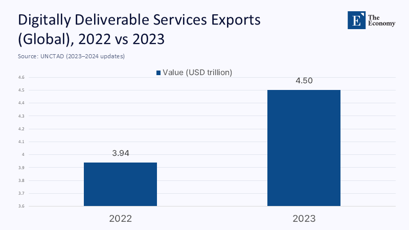 The data show a trading system that bent, but did not break. UNCTAD estimates that global trade expanded 3.7% in 2024 to an all-time high, propelled by services and by developing economies. At the same time, the WTO expects merchandise trade to be flat-to-negative in 2025 once tariffs and uncertainty filter through supply chains, with the strongest downdrafts in North America—precisely where policy has shifted most. Services trade, by contrast, continued to expand by 6.8% in 2024, and the fastest-growing segment—digitally delivered services—has quadrupled since 2005, reaching roughly $4.25–$4.64 trillion in 2023–24. In short, the tradable economy is pivoting toward bits over tons, a metaphor for the increasing importance of digital services over physical goods, and bits cross borders more easily when rules are stable.
