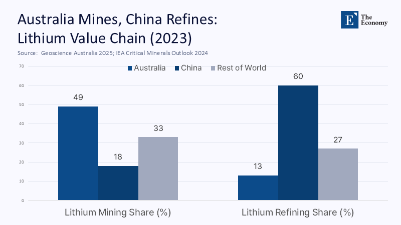 One statistic highlights Australia's situation: nearly half of the world's lithium is mined in Australia, while more than 60% of its processing occurs in China. Coupled with the fact that about a third of Australia's total export value is still directed to China—mainly due to iron ore from Western Australia, where around 80% of the export value goes to Chinese steel mills—the inherent risk becomes apparent. When the same nation purchases the ore and manages the processing that transforms minerals into battery-grade chemicals and magnet oxides, any geopolitical tension or domestic economic slowdown quickly turns into an issue for us. China's recent restrictions on crucial inputs like gallium, germanium, and graphite highlight how bottlenecks in processing can be utilized as political tools. As China grapples with a property market downturn and shifts toward a focus on self-sufficiency in raw materials, Australia must also adapt—steering its efforts toward a downstream market with India and Southeast Asia to mitigate reliance on a single country while supporting the energy transition.