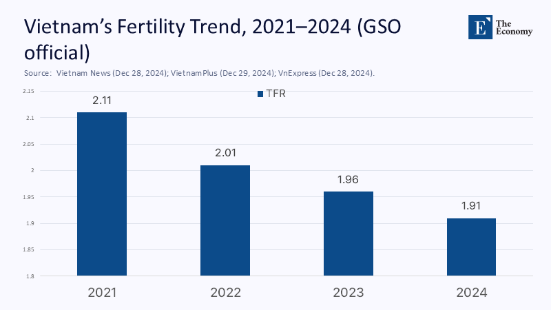 The key figure is not Vietnam’s GDP growth or export proportion; it is 1.91—the predicted total fertility rate for 2024—falling below replacement level and marking the lowest in the nation's history, even as the economy has not yet achieved high-income status. This statistic, which hides deeper issues, highlights the pressing nature of the situation: urban fertility stands at 1.67, with Ho Chi Minh City around 1.39, rates more characteristic of aging OECD countries than of a rapidly industrializing nation. The decline has continued even during the culturally “auspicious” Year of the Dragon and amidst relatively generous maternity leave policies compared to regional norms. The government has abolished its long-time two-child policy, yet the demographic decline remains unchanged. If Vietnam’s workforce reaches its peak in the early 2040s and subsequently diminishes, the typical scenario—where a youthful workforce drives export-led growth—will become less viable before the country achieves high-income status. The critical question is not merely why birth rates are decreasing; it is whether Vietnam can take advantage of a proactive fertility decline by reworking its care system, labor markets, and growth model instead of pursuing costly, low-impact pro-natal incentives.