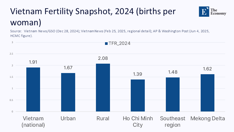 The recent numbers are stark and recent enough to matter for policy. National fertility fell to about 1.91 in 2024, the third straight year below replacement. Urban fertility was roughly 1.67 versus 2.08 in rural areas; Ho Chi Minh City recorded around 1.39, and Hanoi between 1.6 and 1.7. Meanwhile, female labor force participation is high for the region—around 69 percent—so any policy that sidelines women from work is likely to backfire. These shifts coincide with later marriages in the most extensive metro and a rapid urban cost squeeze. Taken together, the data describe a national average that masks metropolitan fertility compatible with the world’s lowest-fertility economies, but without their deep safety nets.