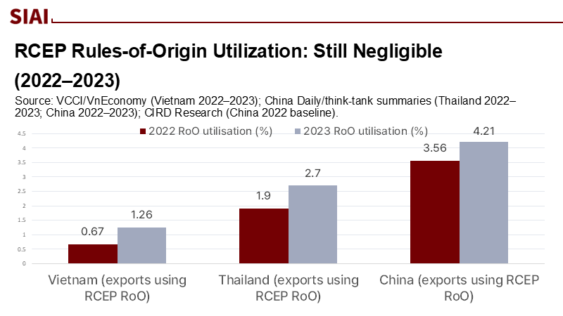 On August 7, 2025, the U.S. implemented a new "reciprocal" tariff framework, raising the minimum duty rate to 15 percent for most trade partners with which it has a trade deficit and eliminating the de minimis exemption for small shipments. In 2024, trade between the U.S. and ASEAN reached approximately $476 billion, potentially resulting in over $50 billion in tariff costs. Intra-ASEAN trade accounts for roughly 22 percent of total exports; however, early data indicate limited utilization of RCEP benefits, with only about 4 percent of Chinese exports and just over 1 percent of Vietnamese exports utilizing RCEP rules of origin in 2023. Fragmented negotiations and underutilized integration options could leave ASEAN economically vulnerable unless it adopts a more unified, union-style approach to its external economic relations.