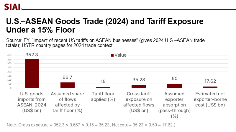 Start with orders of magnitude. U.S. goods imports from ASEAN in 2024 were approximately US$352 billion; at a uniform 15 percent tariff, the gross exposure is approximately US$52.8 billion. Even if only two-thirds of flows are affected and exporters absorb half via price adjustments, the net first-round hit still approaches US$17–18 billion—more than the annual merchandise exports of several smaller ASEAN economies. Add logistical friction from the de minimis repeal and firm-level compliance costs, and the shock compounds. Concurrently, ASEAN's integration cushions are thinner than they appear: intra-ASEAN exports accounted for roughly 22 percent of total exports in 2023, and underutilization of RCEP preferences leaves money on the table every day. Low rules-of-origin uptake means firms continue to pay MFN rates when they could qualify for preferences—especially perishables in a world of sudden surcharges. Fragmented, country-by-country haggling with Washington (or Beijing) also dilutes leverage: what one capital concedes to defuse a tariff threat becomes the benchmark the next capital must beat. A union-style response is not symbolism; it is an actuarial imperative.