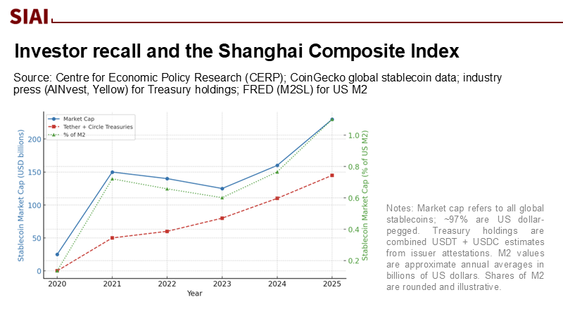 A single private issuer of “digital dollars,” Tether, disclosed $127 billion in U.S. Treasury bills on its balance sheet this summer—more than the holdings of several G20 sovereigns. That is not a crypto curiosity; it is a blunt signal about incentives. Stablecoins have become a yield-powered distribution mechanism for the dollar, routing cash into safe assets while providing users with instant, 24/7 settlement. By contrast, China’s central-bank digital currency (e-CNY) has processed trillions of yuan in domestic transactions but has not lifted the renminbi’s share of global payments above ~2.9%. The market, in short, is rewarding a model where private actors can profit by serving users quickly at scale; it is not yet satisfying a state-led model that lacks cross-border acceptance and profit-aligned champions. The contest between U.S. dollar stablecoins and China’s CBDC will therefore turn on incentive design, not just technology. Today, the incentives clearly favor stablecoins.