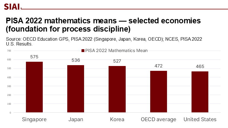 The transferable lesson is not to become "more Chinese," but to treat efficiency itself as an education and industrial policy goal. That begins in secondary school. PISA is not a league table to brag about; it is a diagnostic tool to determine whether fifteen-year-olds can handle the algebra behind SPC charts, the numeracy embedded in preventive maintenance, or the proportional reasoning required to interpret a datasheet. East Asia's advantage is not merely higher means; it is the depth of the middle of the distribution—the large cohort of students who can consistently apply math and therefore scale process discipline across thousands of work cells. Improving that middle in the United States or Europe is slow work: curriculum, teacher training, assessment that values multistep reasoning, and apprenticeship pipelines that treat shop-floor problems as intellectually respectable. The dividend is not only in factories; it is in hospitals, utilities, and municipal services that adopt the same mindset.