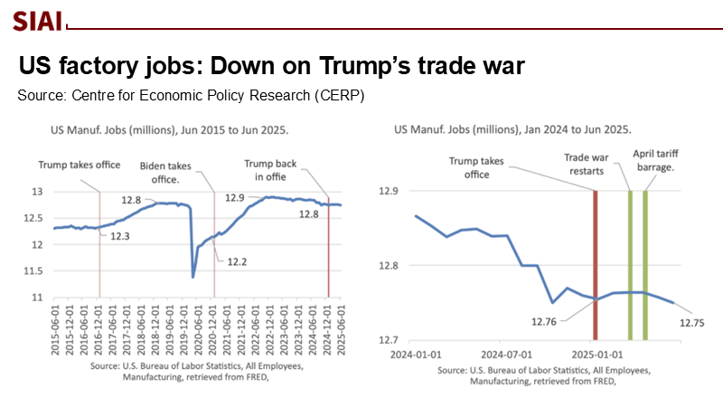 On the growth and reshoring question, the scoreboard is mixed at best. While some marquee projects have localized phases of production, the dominant pattern has been diversion and nearshoring. Mexico supplanted China as the top source of U.S. goods imports in 2023 and has extended that lead, consistent with firms re-routing supply chains rather than fully rebuilding them domestically. Kearney’s 2024 and 2025 Reshoring Index reports describe this as a “reality check,” with U.S. demand shifting to nearby sources but limited net repatriation of complex manufacturing. Meanwhile, factory output has been flat in mid-2025, capacity utilization is below long-run averages, and manufacturing payrolls have softened. Tariff revenue is real, but small relative to macro aggregates; it cannot finance a manufacturing renaissance, and its incidence has landed overwhelmingly on U.S. residents. These are the signature footprints of ISI transplanted onto an economy that is neither young nor autarkic.