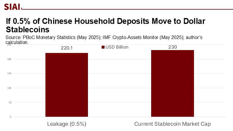 The domestic risk is real. Household deposits in China total well over 300 trillion yuan, with deposit rates this year dropping below 1% in some cases. If just half a percent of these deposits sought safety or utility in dollar stablecoins, it could mean around 1.6 trillion yuan—more than $200 billion at recent exchange rates—shifting towards tokenized dollars. This amount is nearly equal to the current stablecoin market. We base our calculation on 0.5% of the People's Bank of China (PBoC)-reported outstanding deposits (approximately 317 trillion yuan at the end of May), then divide by about 7.2 RMB/USD. The point is clear, though not precise: small percentage movements in such a large pool can influence global markets and reinforce dollar-token dominance domestically.