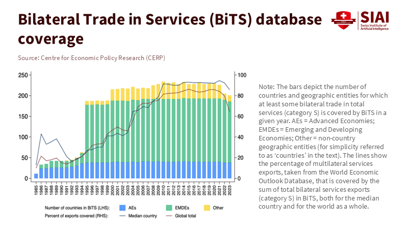 The new Bilateral Trade in Services (BiTS) database tracks flows for up to 245 economies across 12 major categories since 1985. Its first big lesson is about distance: the estimated distance elasticity for overall services trade has moved toward zero over the last two decades, consistent with the practical decline in geography in Mode-1 trade. The second lesson is about composition: a larger share of services is now delivered digitally, shifting the mix toward professional, ICT, and audiovisual segments where the primary constraints are data rules, standards, and recognition—not tariffs. This is why we see rapid growth without corresponding growth in freight. The “pipes” are cables and clouds. The choke points are policies on data use and market entry.