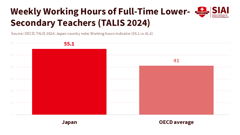 People, not just policies, bear the burden. Japan's centralized model ensures uniform standards, but it also results in very long teacher workloads. TALIS 2024 reports that full-time lower-secondary teachers in Japan work about 55.1 hours per week, compared to an average of 41 hours across participating systems. This level of stress threatens teacher well-being and limits time for planning and collaboration—critical activities that support quality when under pressure. Governance can mobilize resources; it must also safeguard the individuals who translate policy into effective learning.