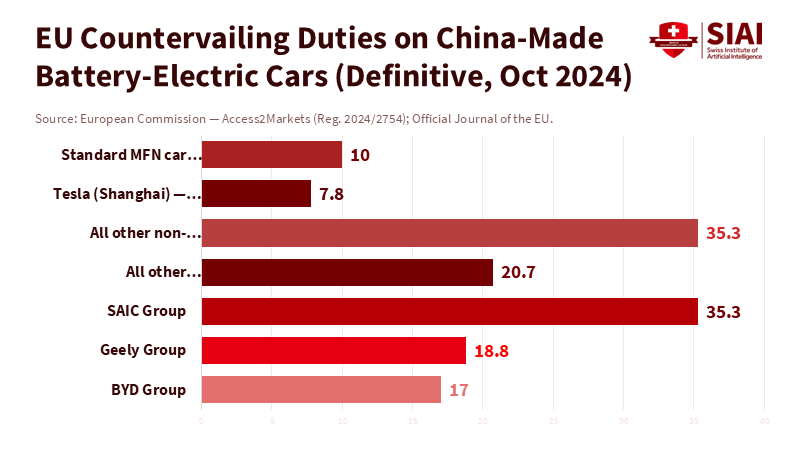In 2024, the European Union ran a €304.5 billion goods deficit with China. Only 8.3% of exports from the EU went to China. This imbalance shaped the negotiations this year. Europe could wait; Beijing could not. Two more facts are essential. First, Brussels imposed five-year countervailing duties on Chinese battery-electric cars: 17.0% for BYD, 18.8% for Geely, and up to 35.3% for SAIC, in addition to a standard EU car tariff of 10%. Second, Washington established a 10% global baseline tariff in April 2025, with higher reciprocal rates on several countries later that summer. In this context, July’s EU-China summit in Beijing produced some symbolism but no breakthroughs. The stalled EU-China trade deal is not a failure in negotiation; it reflects a shift in leverage. Europe’s options outside a negotiated agreement have improved, while China faces mounting pressures at home and abroad. In this new situation, “no deal yet” is a strategy, not a sign of passivity.