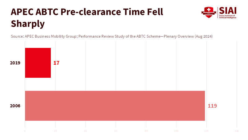 Consider mobility. The APEC Business Travel Card (ABTC) began as a pilot in 1997. It now includes over 460,000 cardholders across all 21 economies. This card, which allows for pre-clearance and fast-track lanes, has significantly reduced waiting times, eased last-mile connections, and lowered costs for small exporters, researchers, and university technology-transfer teams. Before the pandemic, average pre-clearance times dropped from 119 days in 2006 to 17 days in 2019, demonstrating clear efficiency. The latest review in May 2025 confirmed ongoing improvements and the pressure for reform. Businesses and campuses benefit when trips that once took months to clear can now be accomplished in days. APEC economic cooperation is evident in calendars, not just formal statements.