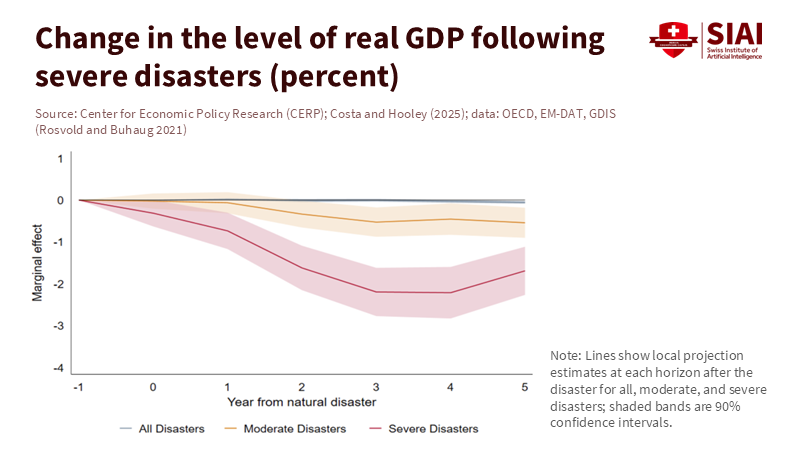 Recent research across advanced economies estimates that extreme weather leads to annual output losses averaging about 0.3% of GDP. Roughly half of that loss occurs outside the disaster area due to negative spillovers. This is not an outlier result; it aligns with new spatial studies that find measurable output declines in nearby regions even if they escape direct damage after a severe disaster. Losses can also linger. Current estimates suggest multi-year impacts on regional GDP following the initial shock. Simply put, climate spillover costs arrive quickly, spread widely, and stick around. Policymakers focusing only on direct damages will consistently fall short.