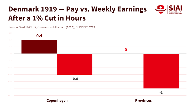 VoxEU/CEPR (Gunnesmo & Hansen) (2025). “Lessons from Denmark’s eight-hour workday reform.” Historical analysis: 1% hour cuts raised hourly wages ~0.4% in Copenhagen, but weekly earnings fell; employment rose.