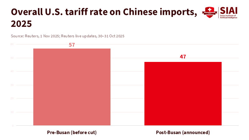 Reuters. (2025, October 30–November 1). What did Trump, Xi agree to on tariffs, export controls and fentanyl? (effective U.S. tariff rate cut to ~47% from ~57%).