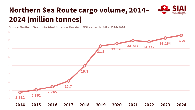 Traffic statistics along the Northern Sea Route demonstrate how quickly this asset is developing. In 2023, transit traffic reached around 2.1 million tons over 75 voyages, as Chinese and Russian companies moved more cargo through the corridor. In 2024, cargo volume along the route rose to a record 37.9 million tons, with more than 3 million tons transiting on 92 voyages. Trade along the NSR has increased several times since the mid-2010s. Most of the increase has come from Russian liquefied natural gas and Chinese-controlled shipping, but the trend is clear. Despite sanctions, war, and insurance issues, the Northern Sea Route is no longer just an experiment; it is becoming a busy thoroughfare for energy and bulk goods, with Russia controlling access.