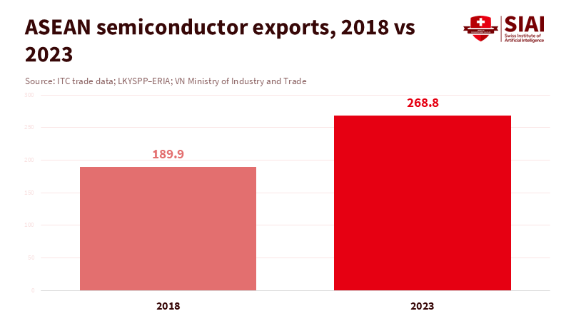 Southeast Asia's manufacturing occupies an advantageous position. It offers lower wages than coastal China, improved infrastructure, and a network of trade agreements linking ASEAN to major markets. This combination is reflected in export data. Official and industry reports from Vietnam’s Ministry of Industry and Trade and regional trade agencies indicate that ASEAN’s semiconductor exports reached US$268.8 billion in 2023, about 23.6 to 25 percent of global semiconductor exports, after growing 41.6 percent from 2018 to 2023. Analysts from Rhodium and others report that Vietnam’s share of global consumer electronics exports rose from 8.3 percent in 2017 to 10.4 percent in 2023 as major companies moved assembly operations from China to the region. While these changes may seem small compared to China’s massive figures, they are significant because new capacity leads to the development of new skills and ecosystems.