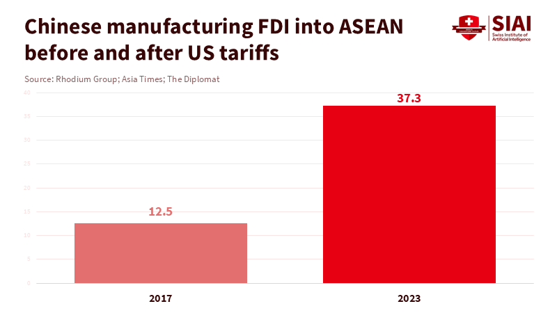 Southeast Asia manufacturing provided a ready alternative. Analyses based on Rhodium Group data show that Chinese manufacturing foreign direct investment (FDI) in ASEAN soared from US$12.5 billion in 2017 to US$37.3 billion in 2023, making ASEAN the primary destination for Chinese companies looking to expand their manufacturing footprint. Rhodium analysts state that US tariffs on China since 2017 have been a key reason for this increase, as companies shift supply chains through ASEAN to maintain access to the US market. This isn’t a case of abstract diversification; it involves actual factories, warehouses, and training centers relocating from China to industrial parks in Vietnam, Thailand, Malaysia, and Indonesia.