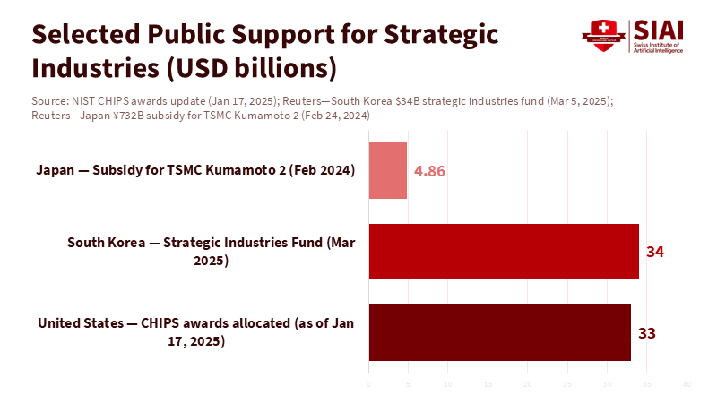 In contrast, Asia's recent actions have shown a different approach. Japan has complemented substantial subsidies with an institutional focus. In February 2024, Tokyo committed up to ¥732 billion (about $4.9 billion) to support TSMC's second fab in Kumamoto. Japan also pledged over $6.1 billion to Rapidus to develop domestic 2-nanometer capability. These are significant investments aimed at rebuilding a complete chip supply chain, from logic to packaging. South Korea has layered funding on top of its corporate strength, setting up a $34 billion fund in March 2025 to support strategic industries, particularly semiconductors. The Asian model emphasizes scale and speed through close cooperation between government and industry. The U.S. model focuses on competitive allocation, milestone-based funding, and, more recently, equity options for leading suppliers, as seen in an award that included a federal stake in a startup developing a next-generation EUV light source. Both models can succeed. However, both can fail without effective execution.