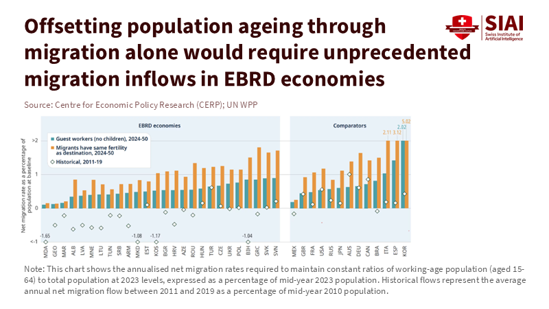 Demographics are not just a trend; they are a reality. Europe is aging quickly, and this trend is here to stay. The percentage of older adults in the EU will continue to rise for decades. By 2050, the EU's old-age dependency ratio is expected to increase to the mid-50s. Fewer workers will mean more retirees. This alone will slow growth and limit funding for schools, training, and research. Immigration can help. However, the scale needed to stop the working-age share from declining is much larger than what political discussions suggest. Recent studies indicate that, even under "guest worker" assumptions, many economies would require annual migrant inflows of 0.5% to 0.9% of their populations. Suppose migrants settle and have children at local rates. In that case, the necessary inflows exceed 1% in nearly half of the affected economies and exceed 2% in rapidly aging countries. Migration can help, but it cannot fully replace births.