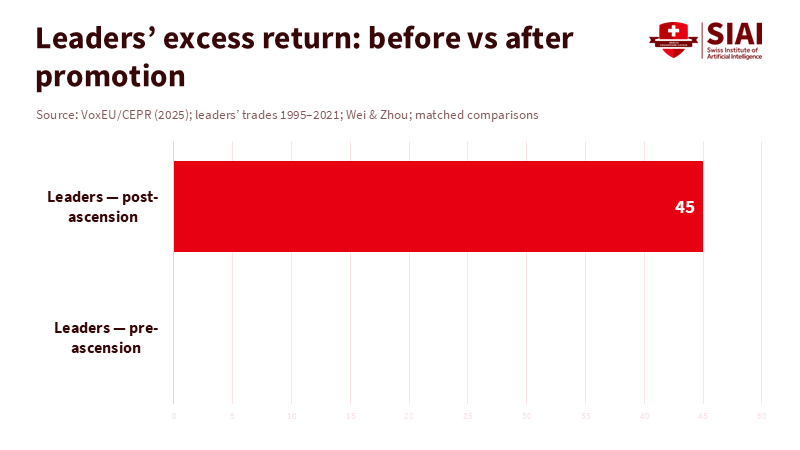 The proof has piled up. Ten years ago, some studies suggested that members of Congress could beat the market. Regular members would've been better off with a basic index fund. But things change at the top. Normal members? No advantage. Real advantage? Power. When certain members become leaders – like Speaker, floor boss, whip, or caucus chair – their trades start raking in extra cash that lasts. It's a big difference: leaders' trades crush those of similar non-leaders by 40-50% each year. This data only includes people who traded both before and after their promotion. The timing is the key!. It's not that they are stock-picking geniuses; it's that leadership gives them new info and the power to set agendas.