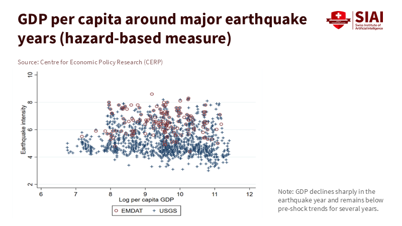According to recent studies, it’s not just those mega-earthquakes that mess with the economy. When you look at all earthquake data, not just the ones big enough to make headlines, you see a pattern. Per capita GDP drops in the year of a quake and stays low for years, mostly in poorer countries. Richer countries can handle it better because they have stronger building codes, better insurance, and greater access to credit. It turns out that what looked like a return to normal in past studies was just due to incomplete data. Actually, moderate earthquakes have significant, long-lasting adverse effects in less wealthy areas.