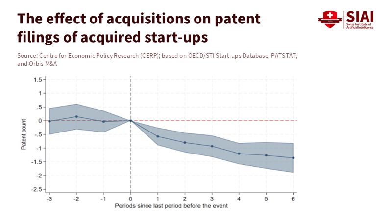 A study of 60 countries and 200 types of businesses found that start-ups don't generate as many new ideas after they are bought out, compared to similar independent companies. The biggest clue is patents. Start-ups file way fewer of them after being acquired – about 1.5 times fewer than before the deal. Some stop filing them at all. Other studies see the same thing. One study reports that patent production drops by about 27% after an acquisition. Studies on inventors show that when a key scientist leaves after a merger, the number of patents they’re expected to produce in their career can fall by around a third. Basically, innovation slows down after a buyout because of structural and people changes. This isn't just in one industry; it happens in tech areas where you'd think companies would be good at absorbing new ideas. So, we should expect this to happen, not panic.