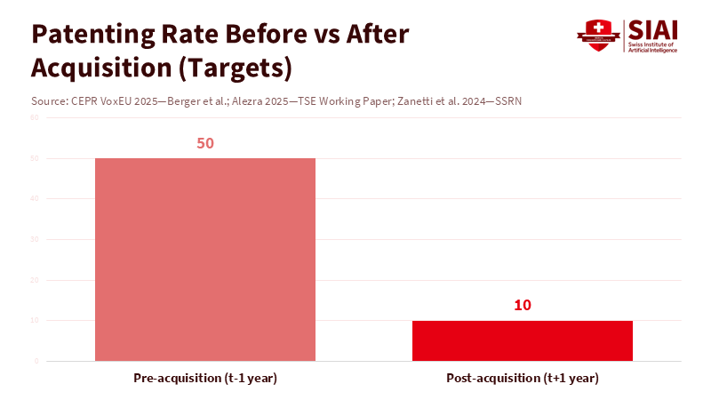 There's a number that should change how we think about innovation after a company gets bought. Before the deal, about half of all venture-backed startups filed for patents. After? Only about 10% do. This isn't just a small drop. It's what usually happens. It shows that innovation slows down after a buyout, not because the founders get lazy or the team loses people, but because the new owner has different priorities. These priorities – like staying compliant, avoiding brand risks, being efficient with money, and fitting everything together – make sense, but they also slow things down. When a big company's way of doing things meets a fragile startup, the startup usually bends. People often think we can come up with rules to keep the startup's pace within the new company. But the numbers tell a different story: innovation usually slows down after a buyout, even when it looks like a good match. So, the question isn't how to avoid the slowdown altogether, but how to limit it, plan for it, and work with it.