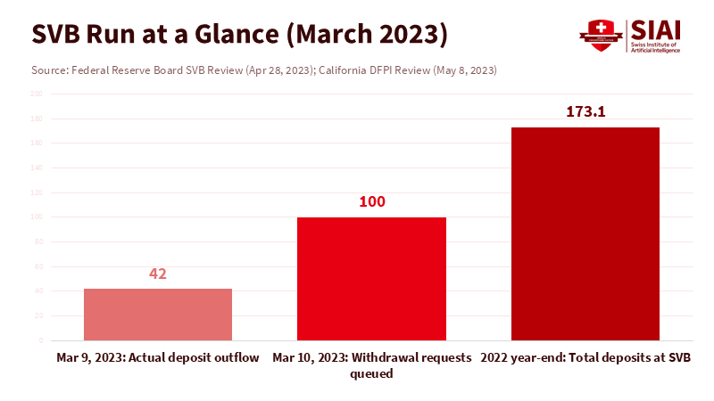 Silicon Valley Bank is a perfect example of how quickly things can fall apart. At the end of 2022, about 94% of the bank’s deposits were uninsured, making customers more likely to panic and withdraw funds quickly. So when the bank announced losses and a need to raise capital, many customers reacted at once, moving millions in minutes via their phones. By March 9, $42 billion had been withdrawn, and regulators estimated that requests for March 10 would have reached $100 billion. It wasn’t a slow drain; it was a mad dash.