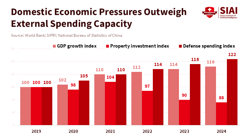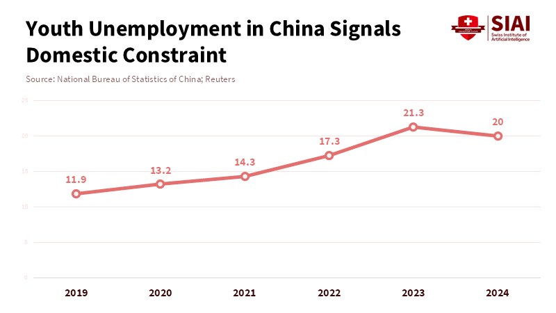 The logic is clear: When youth unemployment is high, the property market is slowing, and the population is ageing, this pushes political risk towards domestic solutions. If more than 20% of young urban residents struggle to find jobs, national ambitions are refocused. While China can allocate funds to defense and projecting power, as it did with consecutive increases in military spending, there are limits. Funds and skilled workers dedicated to public order and economic recovery are not available for extensive power projection.