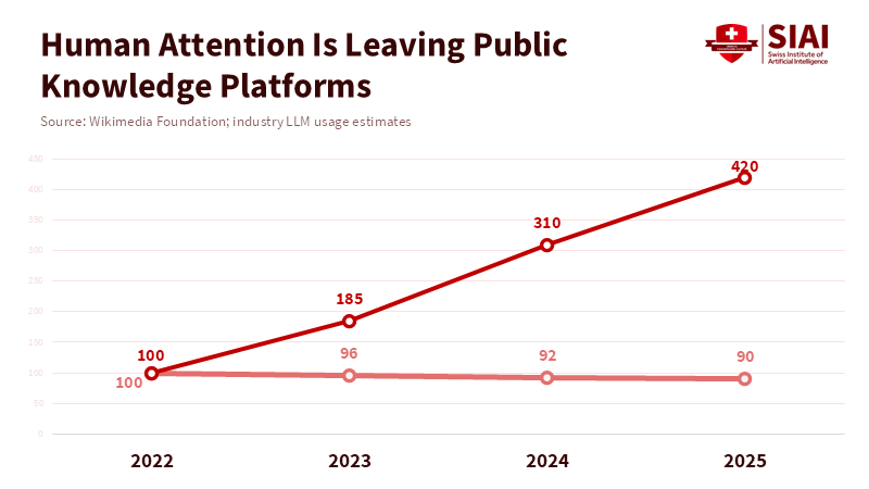 The timing of these changes supports this idea. The sharpest drops in user activity seem to happen right after new LLM products are released. Data from platforms and community reports agree: Questions and discussions that used to drive many page views now often lead to an AI summary, with no one clicking back to the source. This shift in behavior changes what we value, moving away from a living page—with its discussions, revision history, and visible corrections—to a quick, temporary answer. If public knowledge is judged by these short-lived answers, the system we have for maintaining, questioning, and documenting knowledge will weaken over time.