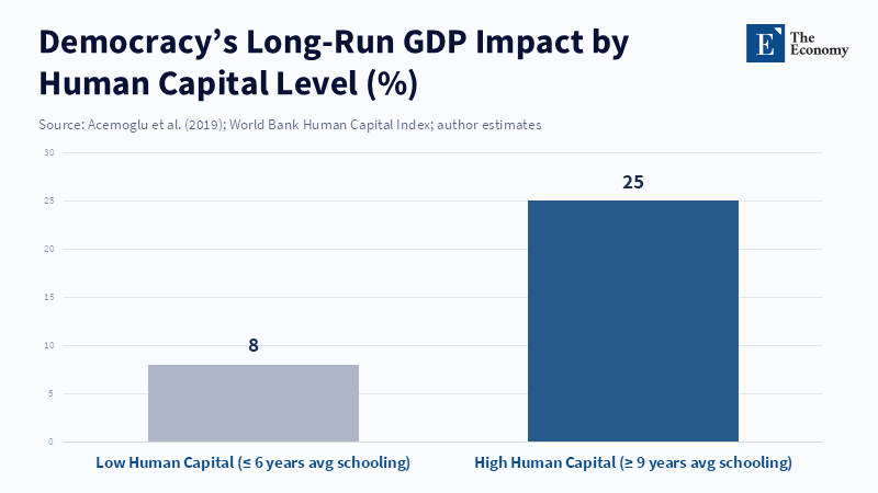 Democracy raises growth most where human capital is already strong Freedom and skills act as multipliers, not substitutes, in economic development Sustained prosperity requires joint investment in institutions and people