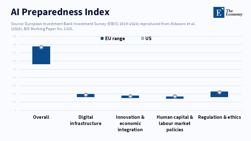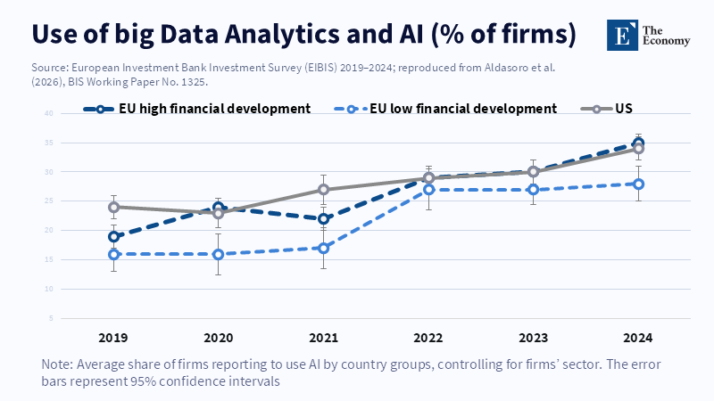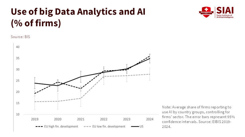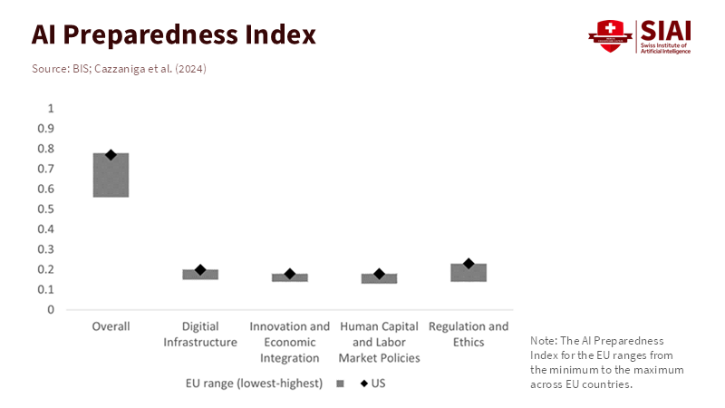 There's a big difference between having rules and actually using AI. When people use AI regularly at work, they learn from experience and find ways to improve their work, thereby increasing productivity. But if you have rules without practice, things get stuck. The Bank for International Settlements (BIS) estimates that when EU businesses use AI, their labor productivity increases by approximately 4% in the short term. This is a positive sign, but that increase occurs only when AI is genuinely part of how work is done and when businesses invest in making it work well. If we count rules without counting how often people use AI tools, we might think we're making progress when we're not.