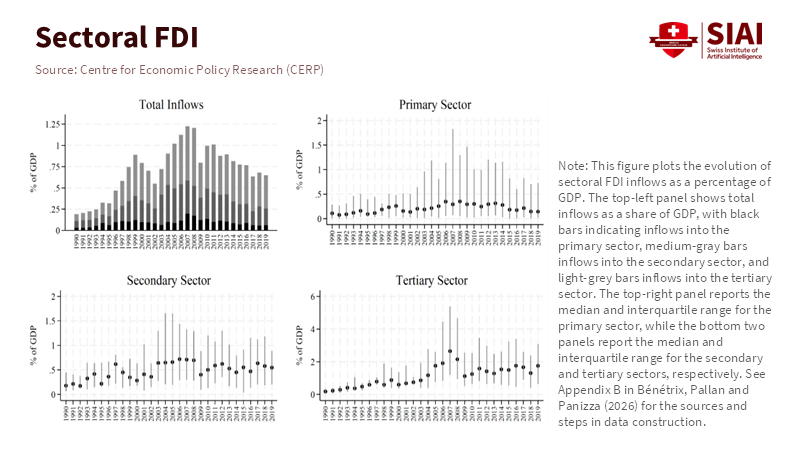The standard story of FDI as a channel for local capital accumulation and technology transfer—think factories that buy local inputs, train local managers, and generate supplier networks—still exists in fragments. But it is no longer the dominant template in many strategic sectors. Reframing means recognizing that the primary margin of value creation in modern FDI lies in positioning within an international sequence of specialized tasks. In that configuration, a foreign plant’s “success” is judged by its access to transnational suppliers, its ability to embed into multi-tier sourcing networks, and its contribution to a firm’s global output rather than by the extent to which it sources domestically or creates broad-based local linkages. This reframing matters because policies and pedagogy that assume the old model will misread incentives, misallocate incentives, and misprepare managers. The CEPR literature and recent empirical reviews foreground this conceptual shift: the link between FDI and aggregate growth has weakened as production has fragmented across borders, not because investment has lost value, but because its value is redistributed across countries in ways that traditional national statistics do not readily capture.