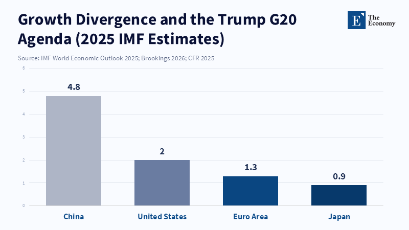 The economic logic is straightforward: when a major country sees a rival growing faster, it can cooperate internationally or use its own tools to compete. The U.S. is choosing the second. Since 2023, it has employed tariffs, exceptions, and targeted incentives, and has treated global meetings as stages for U.S. resolve. IMF data for 2024–25 indicate faster growth in China, highlighting U.S.- China competition. Weak U.S. growth reduces its bargaining power, making short, visible policies more appealing domestically. With a finance-focused G20, the U.S. finds partners for deals that support its supply chains and target threats, rather than agreeing on rules for sustainability or labor.