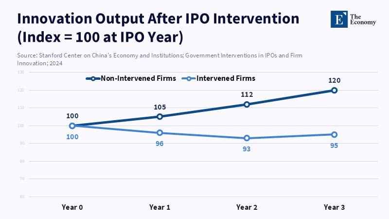 We must confront the evidence about what happens when governments intervene in IPO processes. Recent empirical work that tracks Chinese firms affected by listing suspensions or administrative interventions finds measurable declines in innovation output in the years that follow. Compared with unaffected peers, firms subject to IPO disruptions filed fewer patent applications and received fewer citations, and it took several years for innovation activity to recover. The pattern points to a greater coordination problem: when political calculus, rather than pure market selection, determines which firms receive capital or breathing room, innovation incentives can shift in ways that reduce exploratory investment inside firms. That is not to say that state support always harms innovation; rather, when support substitutes for market discipline without compensating for governance mechanisms, firms may lose the incentive to translate R&D into efficient, economically viable technologies.
