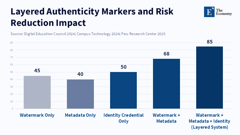 Social markers consist of classroom guidelines and clear indicators. Teachers might require a brief statement of origin with each submission (Created by X; used tools Y; edits Z; content credential attached), and learning management systems could display an icon or link to view the C2PA record. These design choices are important because people tend to trust interfaces. If a student sees an authenticity badge that leads to a readable chain of custody, they will be less likely to assume fraud and more likely to think carefully about the content. International groups and standards-setting organizations are already working to create technical standards for these markers via workshops and meetings on watermarking and multimedia authenticity. Using these standards gives schools a practical way to put markers to use without creating new cryptographic methods or metadata formats.
